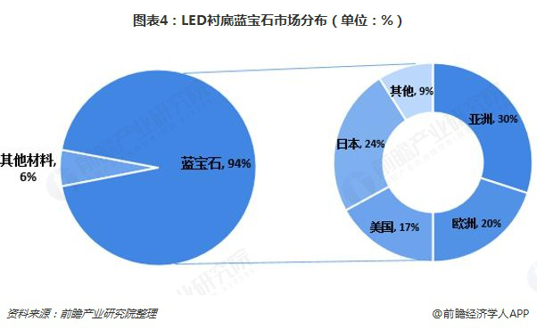 LED襯底主要用作生長(cháng)LED材料,LED材料的生長(cháng)需要在襯底上制作氮化鎵(GaN)基的外延片,這一生長(cháng)過(guò)程常用的襯底以藍寶石為主,占比LED襯底市場(chǎng)的94%。從地區分布來(lái)看,LED襯底用藍寶石市場(chǎng)主要集中于亞洲、歐洲、日本和美國,分別占比世界市場(chǎng)份額的30%、20%、24%、17%,合計占比世界份額的91%。